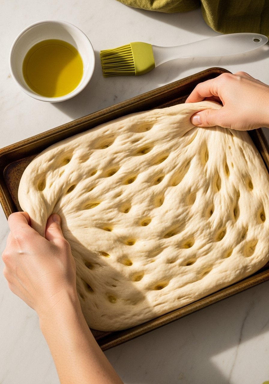 - Use your fingertips to press deep dimples across the surface, drizzle generously with olive oil, and sprinkle minced garlic, rosemary, and coarse salt.