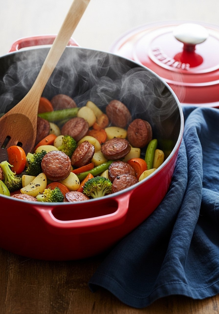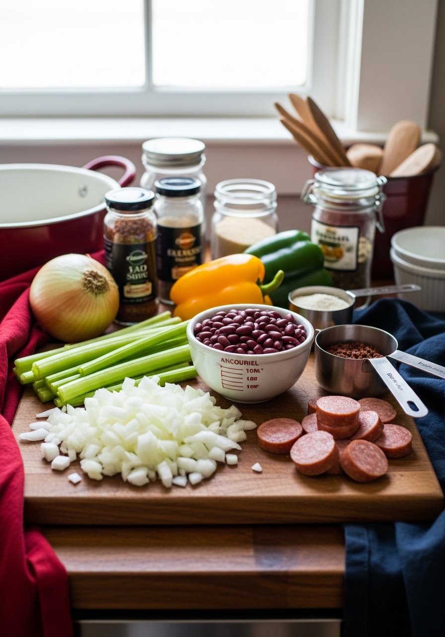 - Slice 1.5–2 lbs andouille or smoked sausage.