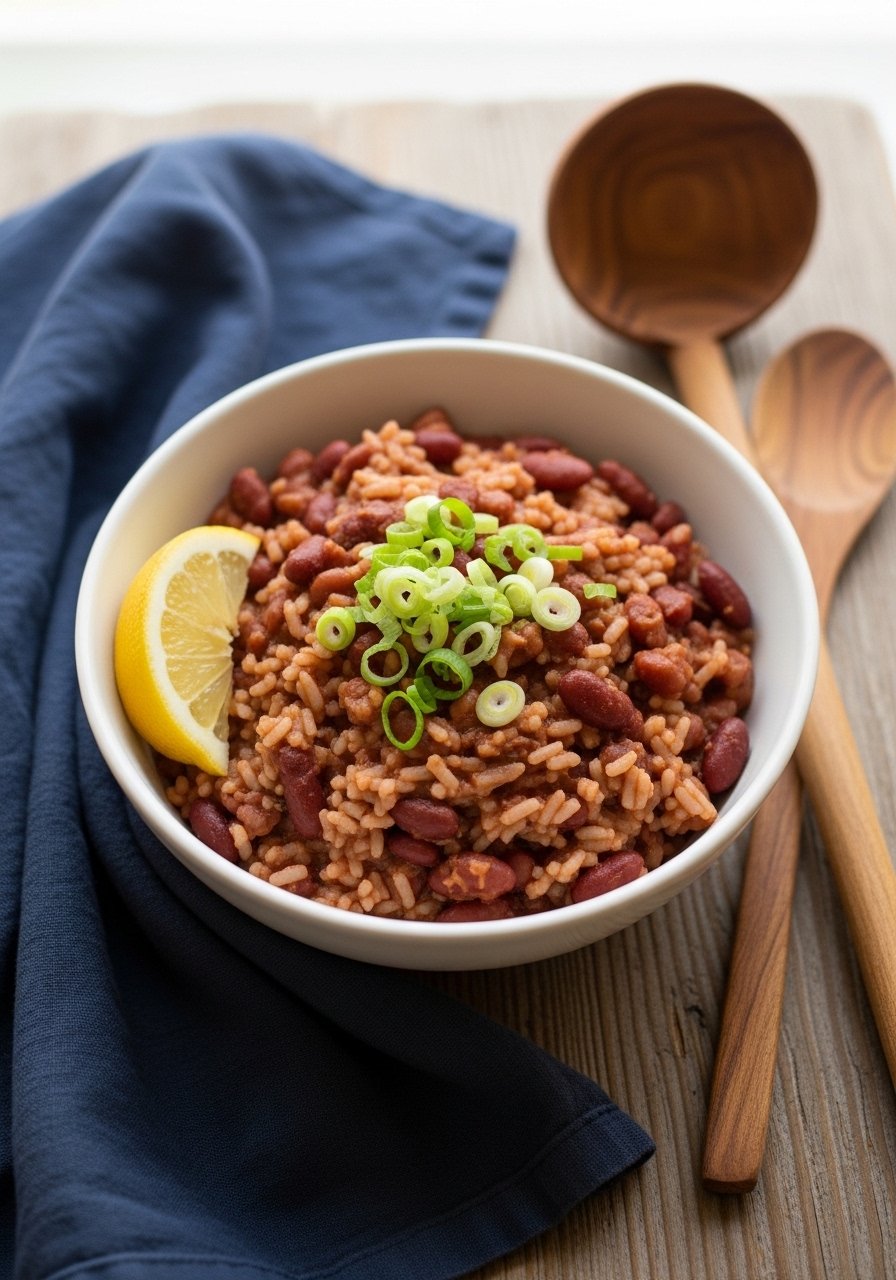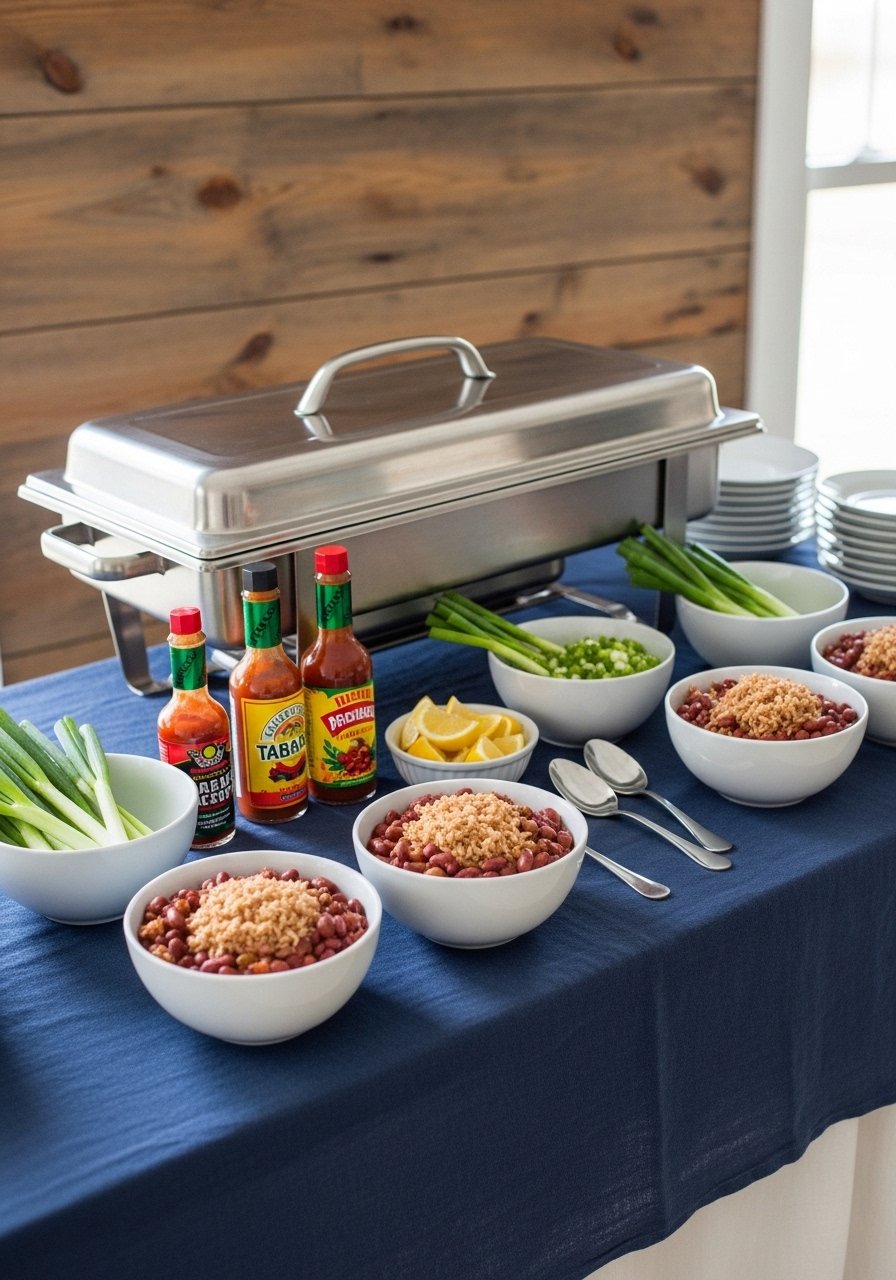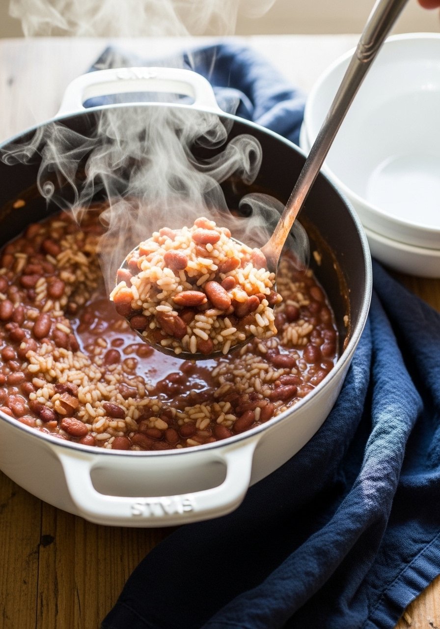 Finish with chopped green onions, hot sauce, or a drizzle of olive oil. Serve hot over rice or toss rice into the pot if you like a more integrated texture. For buffet service, keep beans in an oven-safe pot at 200°F or use warmers.