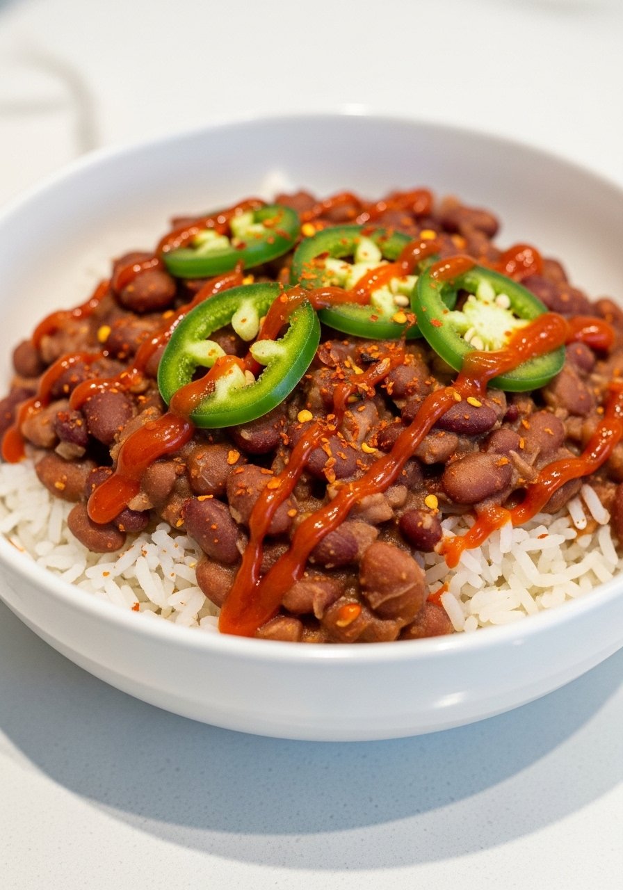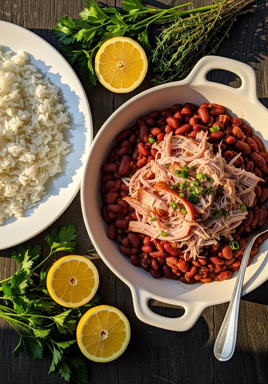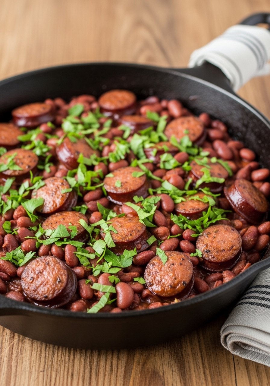 Spoon beans over mounds of steaming rice on a large serving platter. Top with extra sliced sausage and crunchy green onions. Pair with crusty French bread and a crisp green salad. Store leftovers in airtight containers for up to 4 days. Make ahead by simmering the day before—flavors deepen overnight.