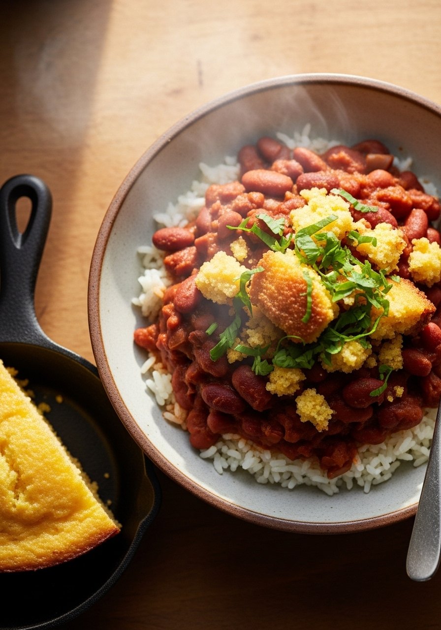 26. Red Beans and Rice with Cornbread Crumble (Textural Crowd Favorite)