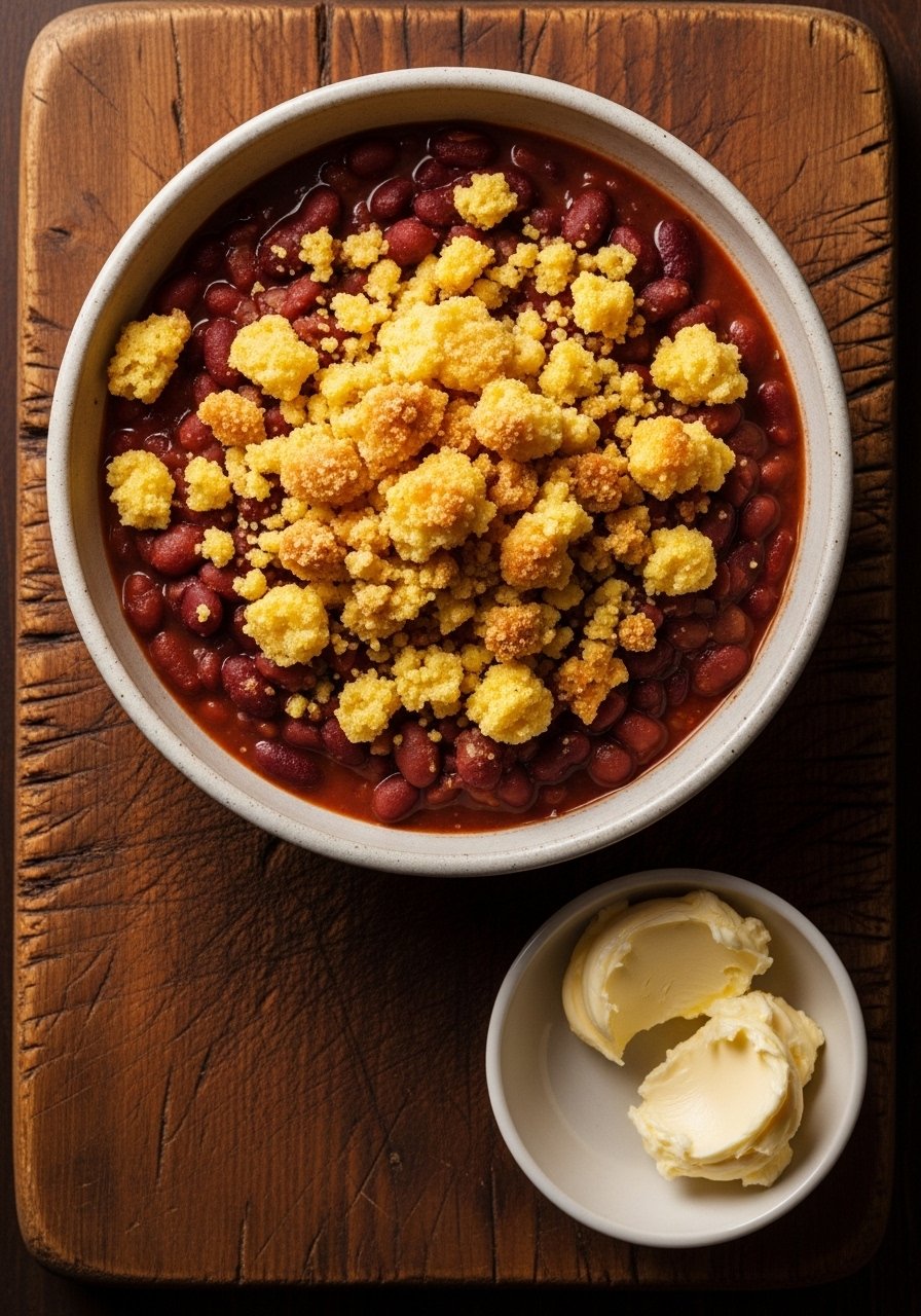 Add a crunchy cornbread crumble for texture contrast—crumbed cornbread folded over the beans adds buttery, slightly sweet notes that pair perfectly with spice.