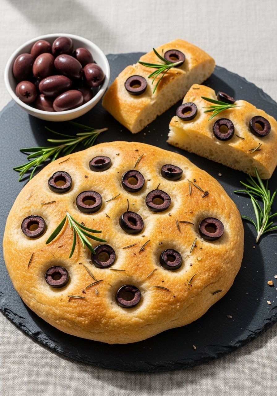 - Press dough into an oiled pan; tuck in halved olives and sprinkle rosemary.
