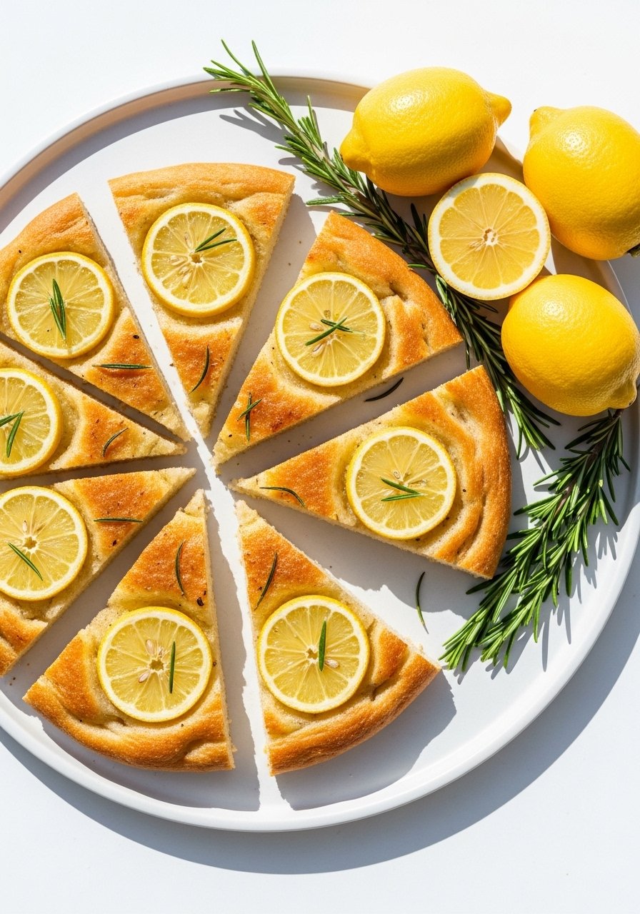 - Press into pan, arrange thin lemon slices (if using) and rosemary into dimples.