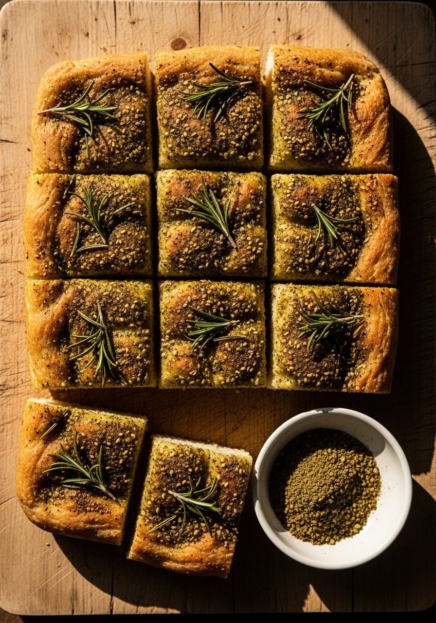 Za’atar brings lemony, herbal, and sesame notes that play nicely with rosemary. This fusion focaccia is fragrant and slightly exotic.