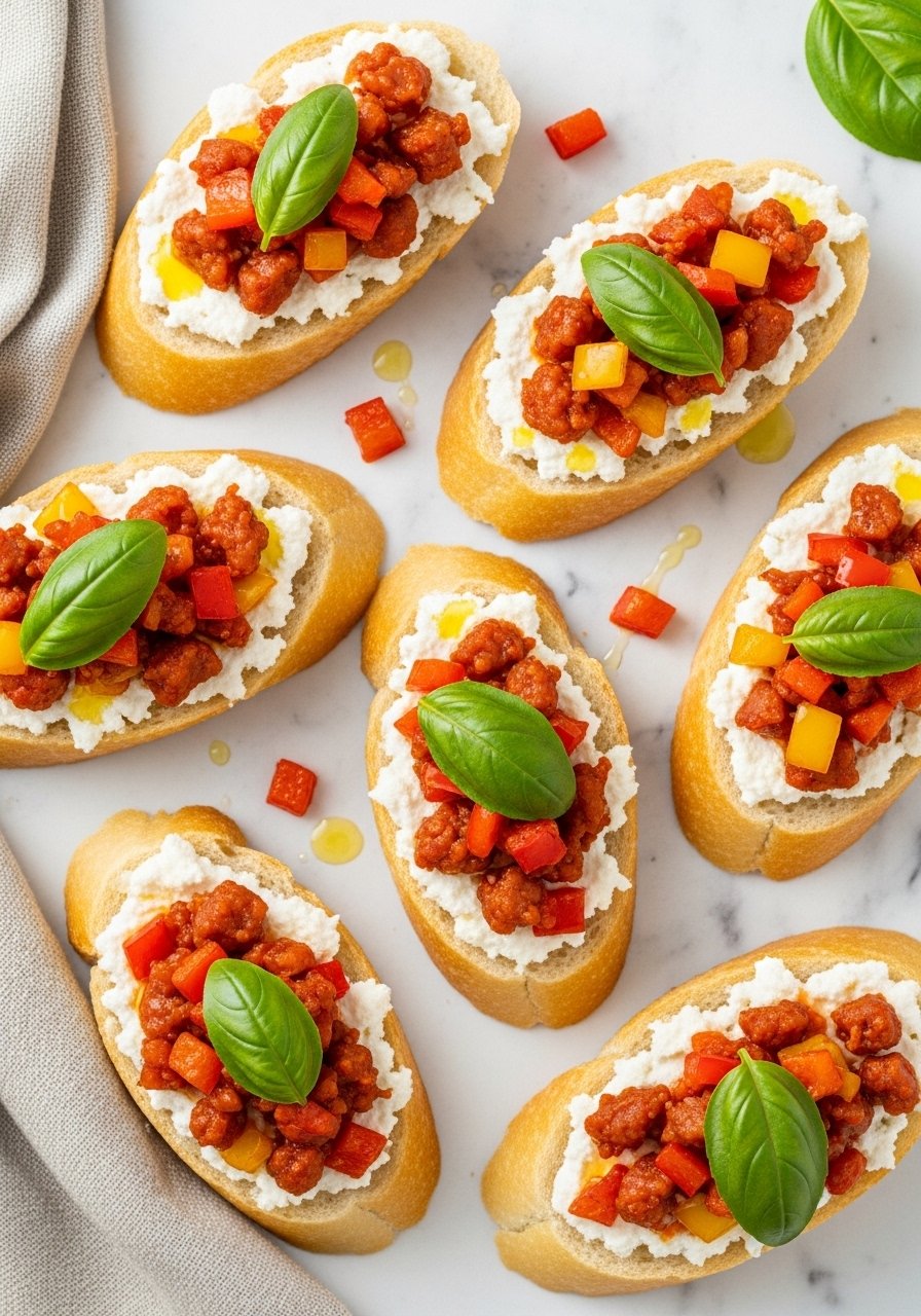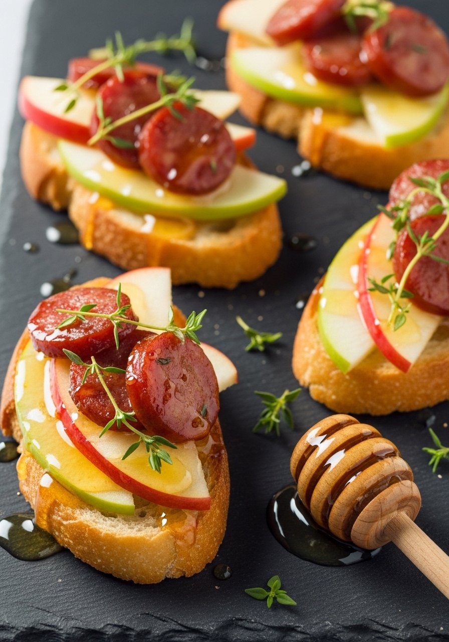 Sweet apple and savory smoked sausage pair beautifully on toasted crostini. A touch of honey and thyme ties flavors together for a refined, seasonal appetizer.