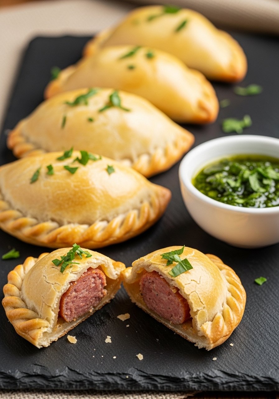 Flaky empanada pockets filled with spiced smoked sausage are handheld and fun. A bright chimichurri cuts through the richness and keeps the flavors balanced.