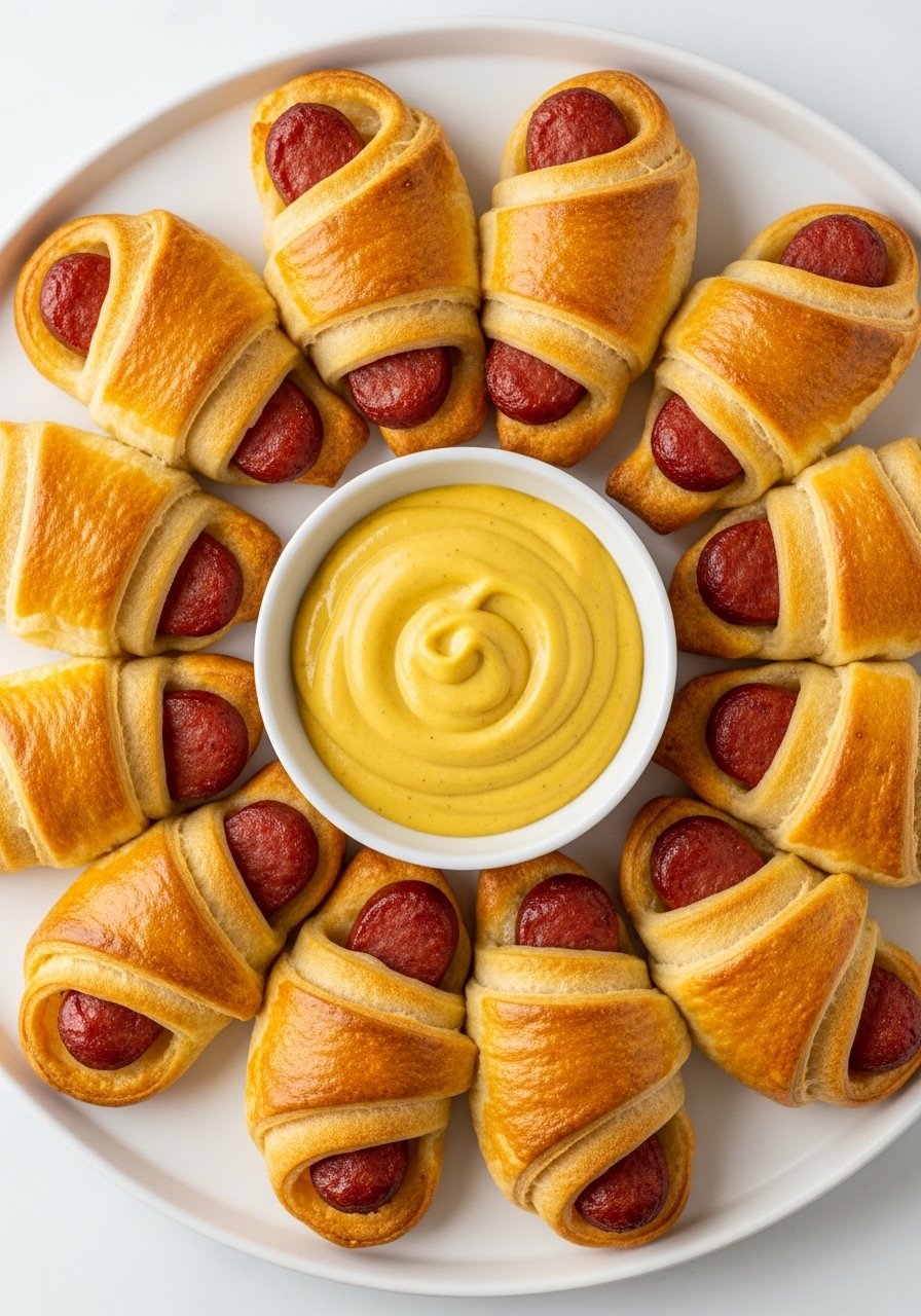 A grown-up twist on pigs in a blanket—smoked sausage tucked into buttery crescent dough with a smear of mustard. They bake fast and are addictively flaky.