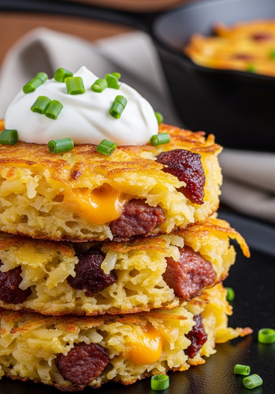 These savory potato cakes are crispy at the edges with smoky sausage and cheesy pockets inside. They’re hearty, easy to make ahead, and reheat well for grazing.