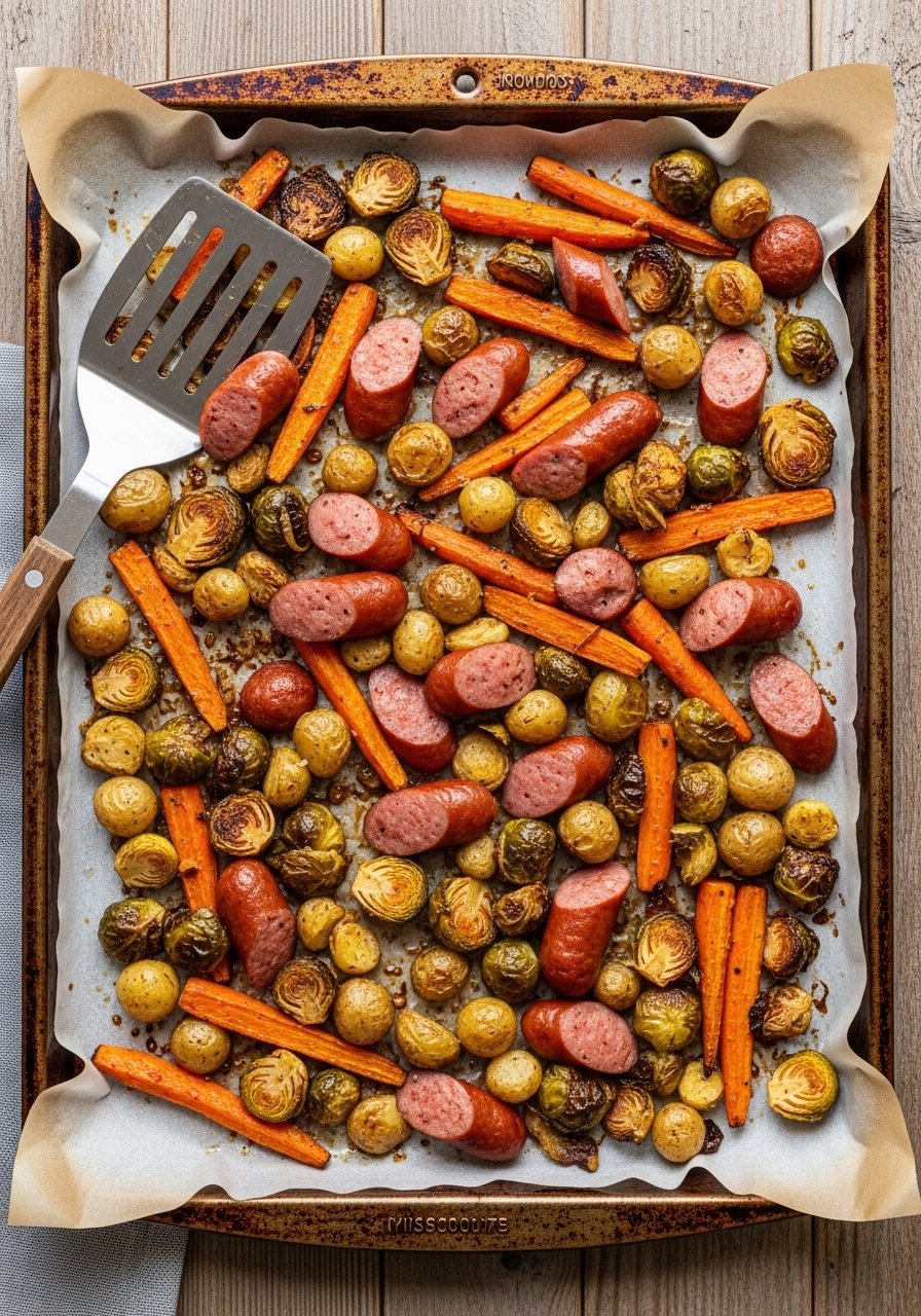 A one-pan sheet dinner that’s hands-off and crowd-pleasing. The high oven heat crisps sausage ends and caramelizes vegetables for contrast in textures. Ideal when you want minimal cleanup and maximum flavor.