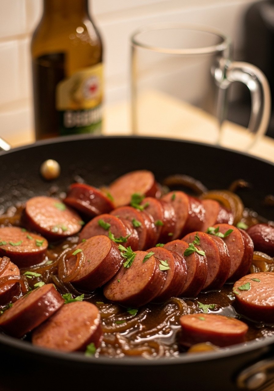 - Add sliced smoked sausage in a single layer. Sear 3–4 minutes per side until browned and edges crisp. Remove to a plate.