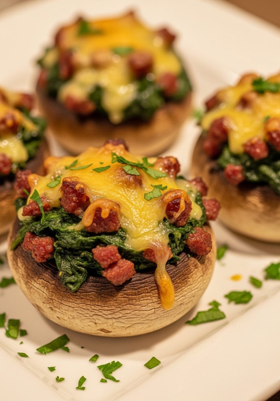 These savory bites combine smoky meat, tender spinach, and melty cheese inside roasted mushroom caps. They’re elegant enough for guests and easy to share.