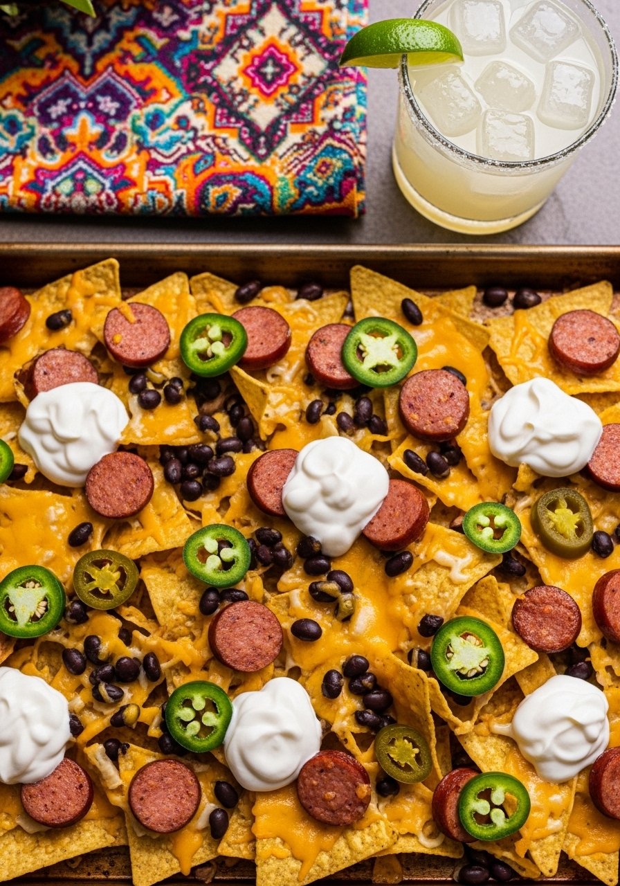 Sheet-pan nachos get a meaty, smoky upgrade with sliced sausage. Quick to assemble and perfect for sharing, they deliver crunchy, cheesy satisfaction with minimal effort.