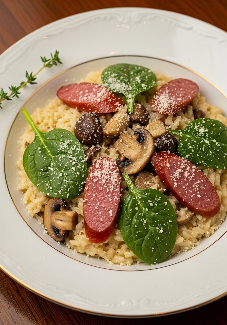 23. Smoked Sausage, Mushroom, and Spinach Risotto