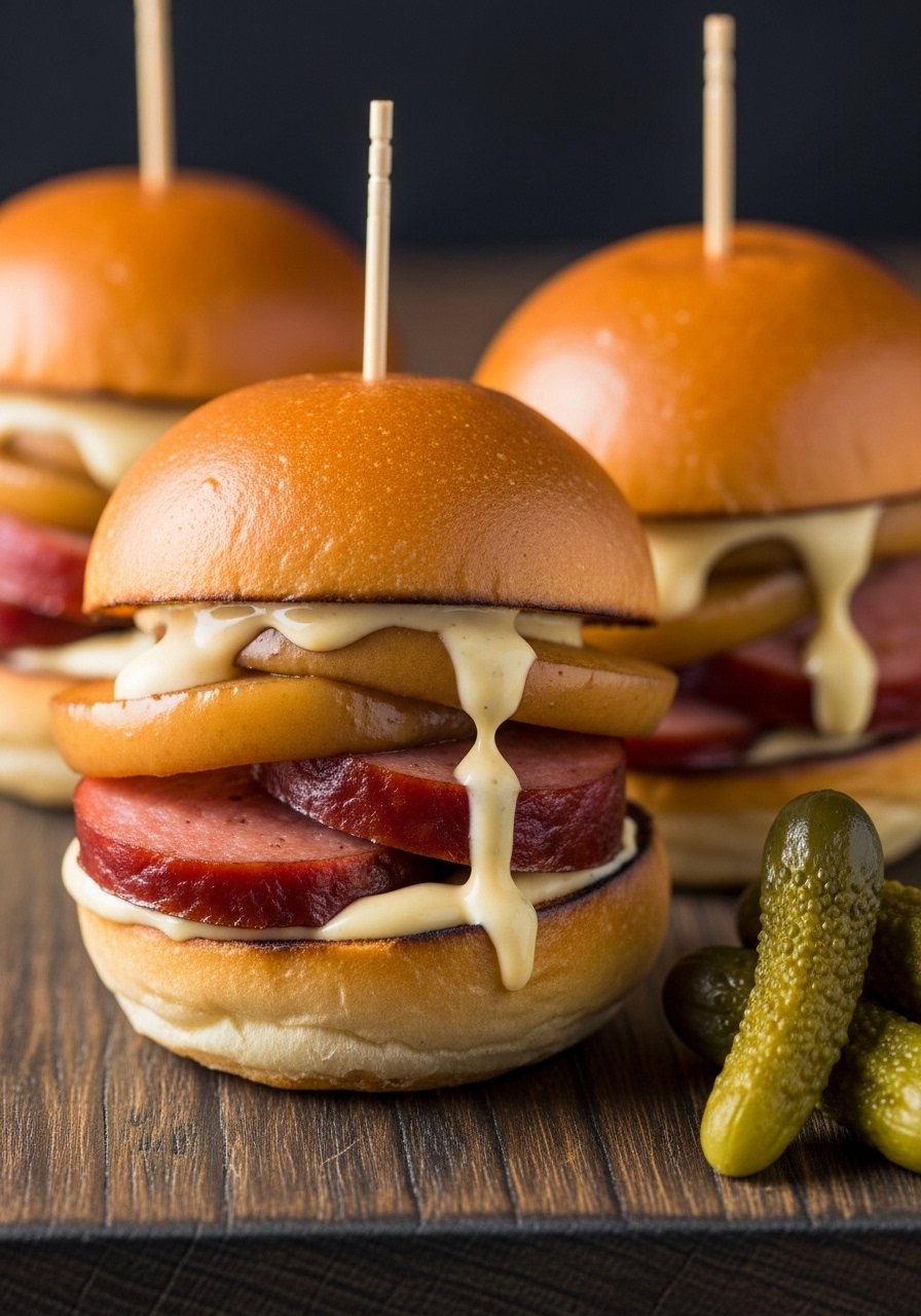 These small sandwiches pair sweet caramelized apples with smoky sausage and tangy mustard aioli. Perfect for game day or party appetizers.