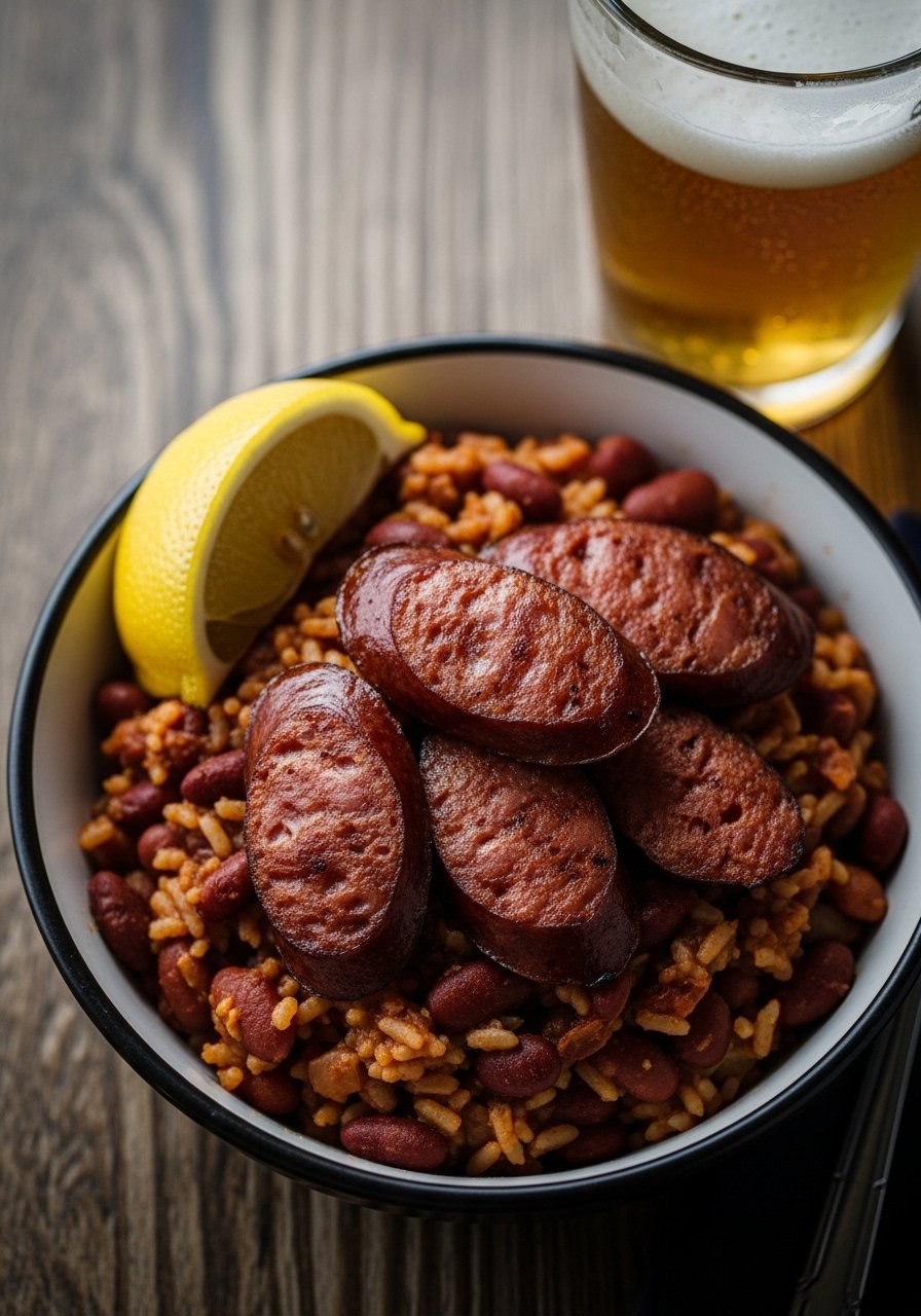 Adding beer brings a malty depth to spicy red beans and rice and pairs beautifully with andouille sausage. This version has a pleasantly bitter backbone that balances the heat. It's a fun twist for game day or backyard gatherings. Sear the sausage in a cast iron skillet for caramelized edges.